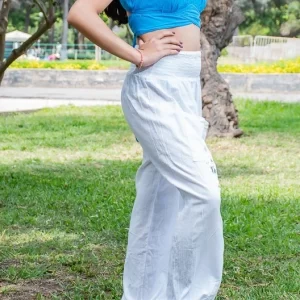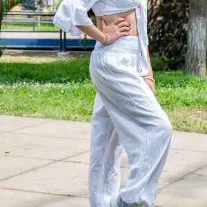 Top cruzado con mangas y tantalon playero en tela plana 100% algodón